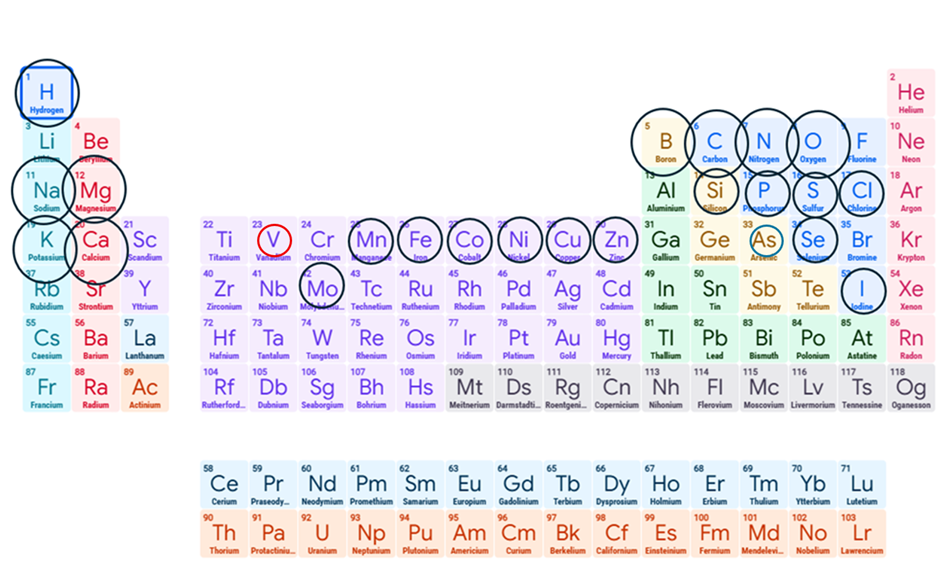 - Elementi Essenziali Strutturali Universali (16 elementi: H, C, N, O, P, S, K, Na, Mg, Ca, Cl, Mn, Fe, Cu, Zn, Mo)